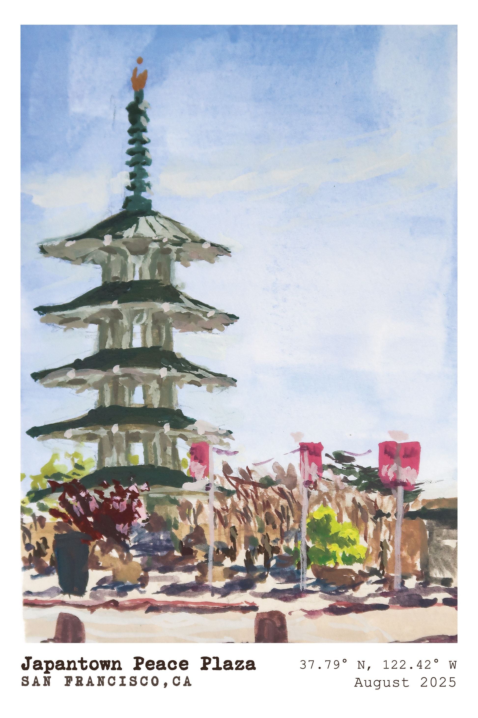 A gouache painting of the Japantown Peace Plaza.