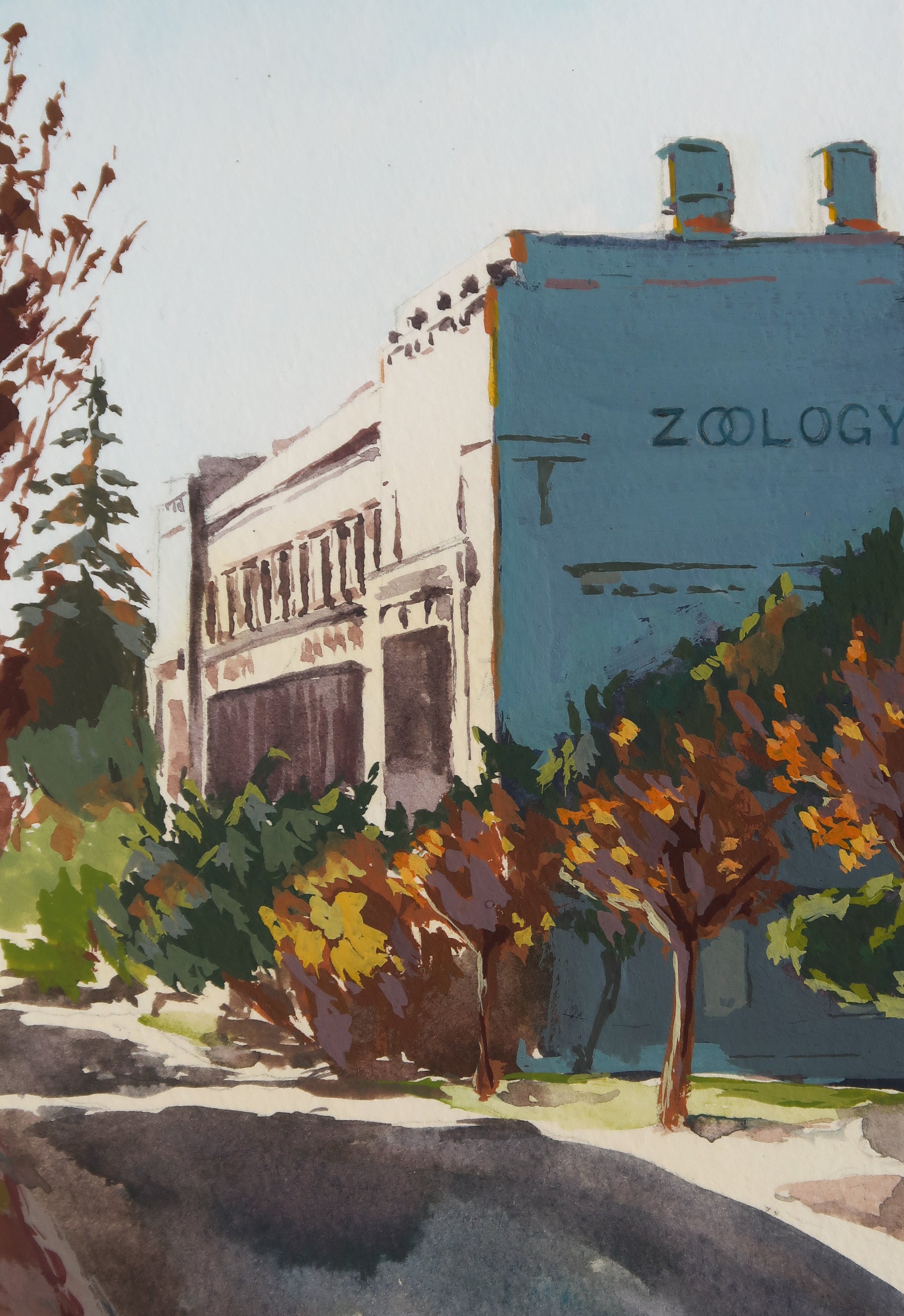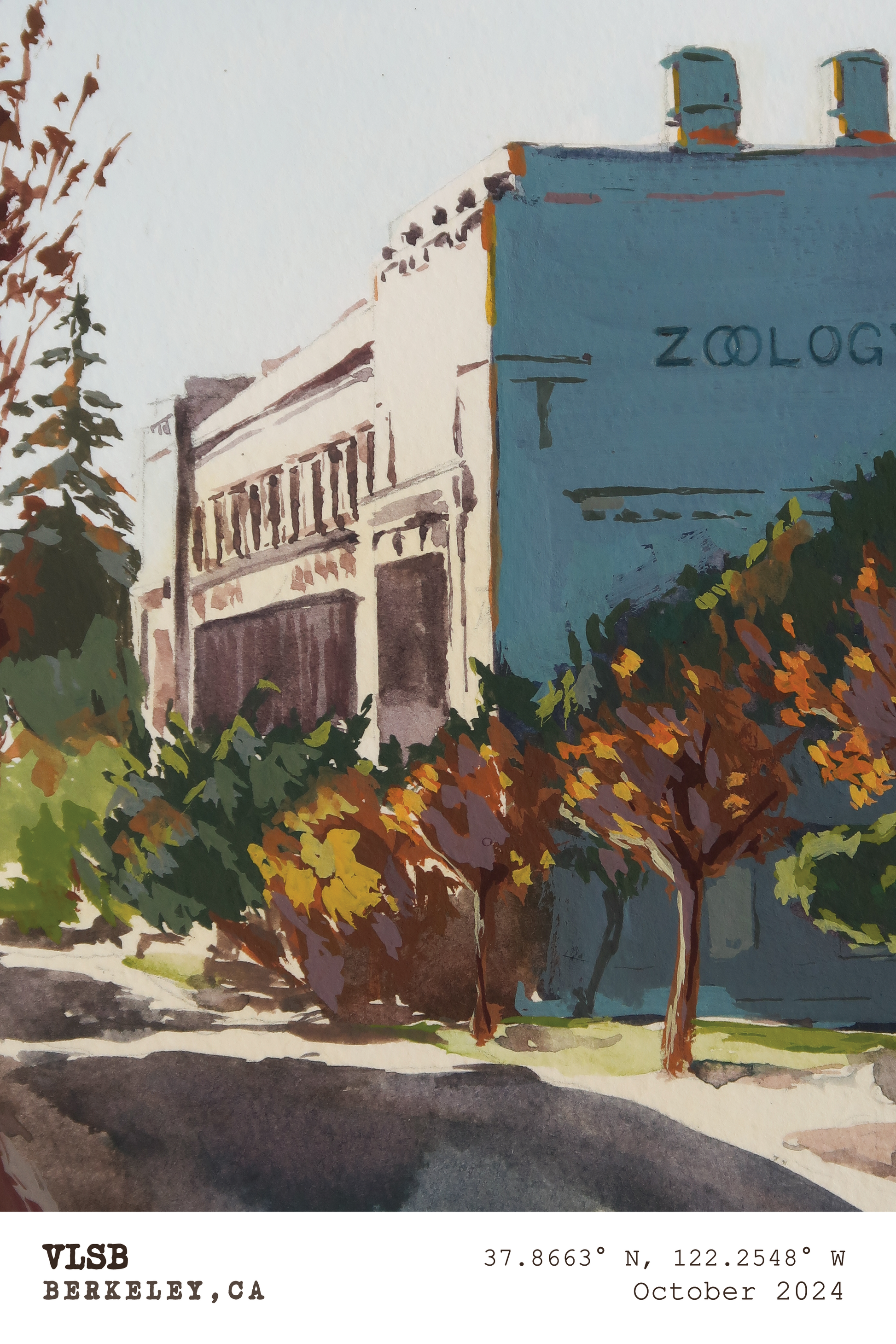 A gouache painting of Berkeley's Valley Life Sciences Building at sunset.